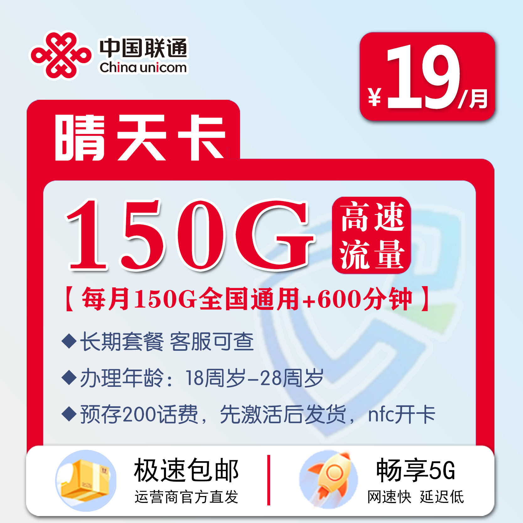 联通19元150G通用+600分钟,长期套餐。