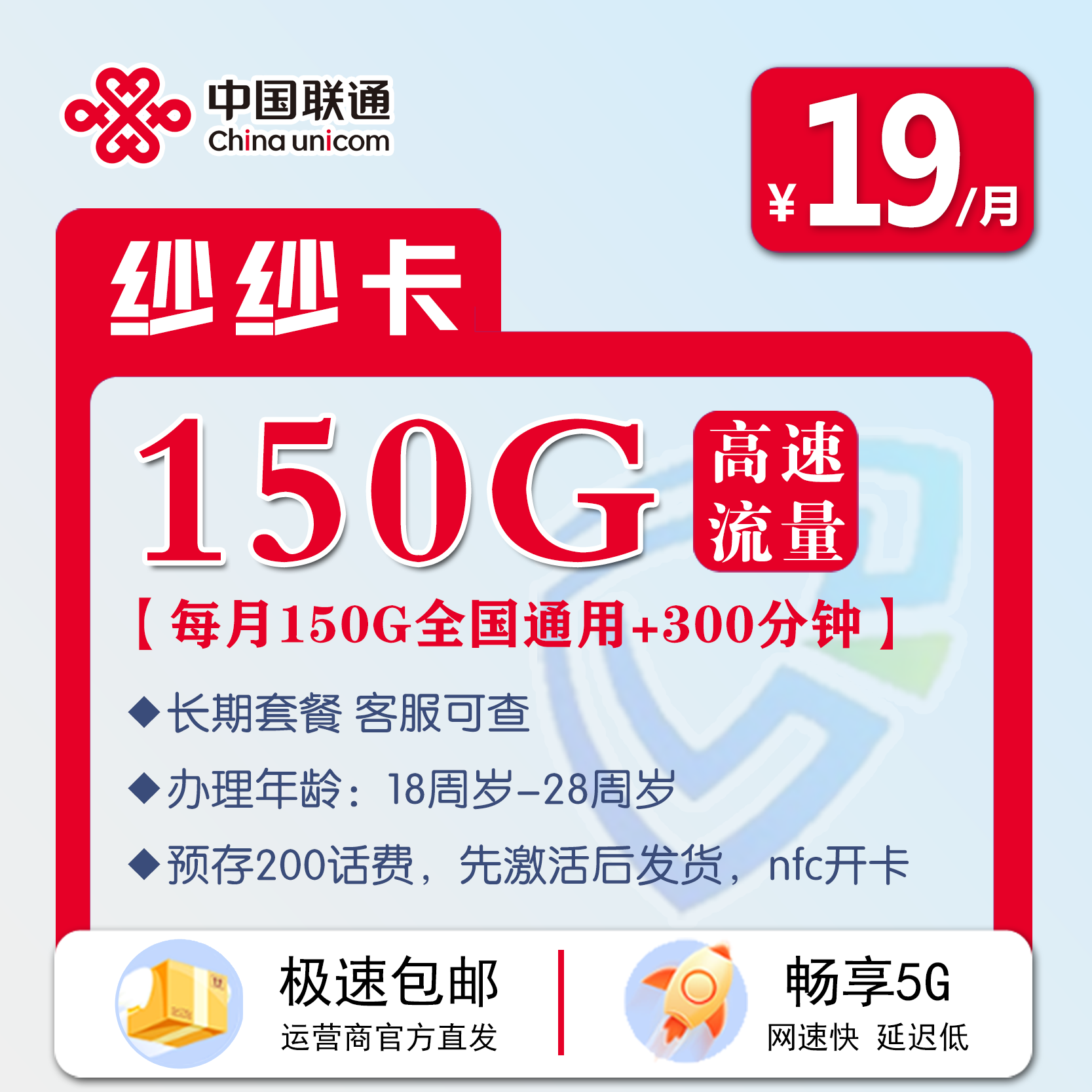 联通19元150G通用+300分钟,长期套餐。