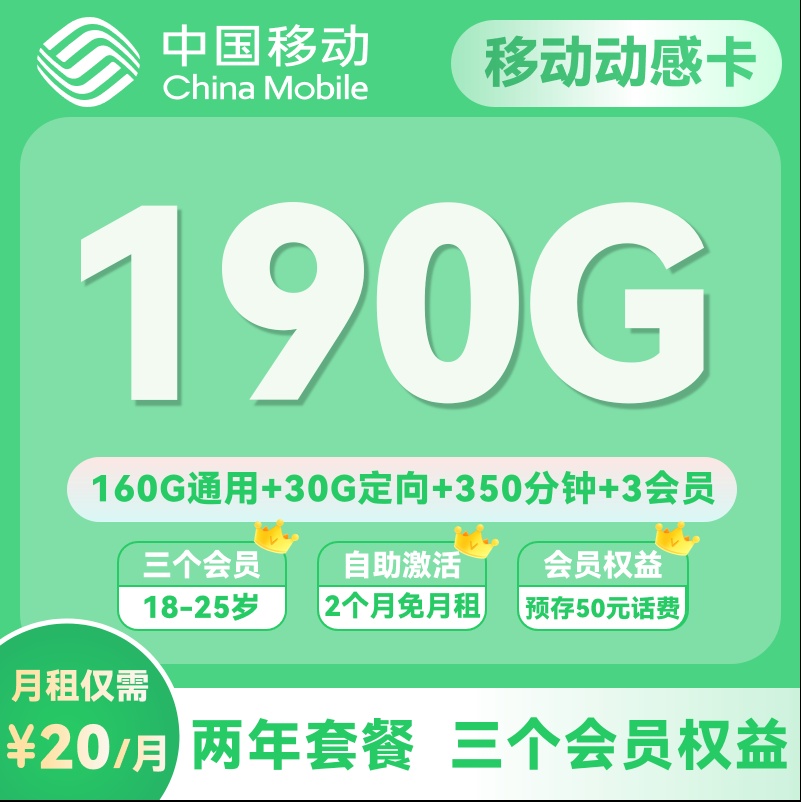20元=190G全国流量+350分钟+3会员权益,两年年套餐,2个月免费